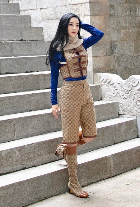 Áo dệt kim giữ nhiệt, khăn lông màu trung tính được Giáng My phối cùng nguyên bộ đồ Gucci.