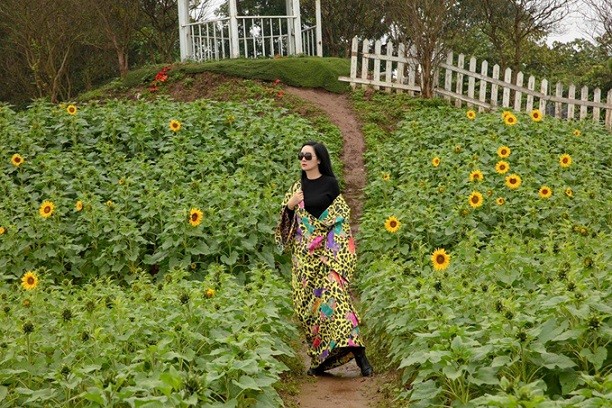 Hoa hậu Đền Hùng phối mũ, khăn đồng điệu họa tiết với váy maxi dài khi 'thả dáng' trên đồng cỏ.