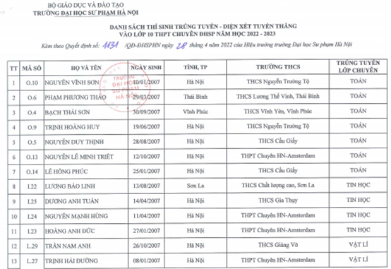 Trường ĐH Sư phạm Hà Nội vừa thông báo kết quả xét tuyển thẳng vào lớp 10 THPT chuyên năm học 2022-2023 của trường với 33 học sinh trúng tuyển theo hình thức tuyển thẳng.