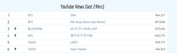 Ba ca khúc còn lại trong Top 5 MV có lượng lượt xem cao nhất ngày 3/4 còn có As If It's Your Last (BlackPink) với 573.424 lượt xem, Fire (BTS) với 560.775 lượt xem và Likey (TWICE) 539.771 lượt xem. Vị trí thứ 6 thuộc về MV Heart Shaker (TWICE) với 476.343 view sau 24 giờ.