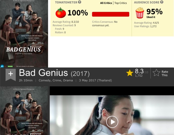 Bad Genius (Tựa tiếng Việt: Thiên tài bất hảo) xứng đáng nhận được điểm số hoàn hảo cho một kịch bản tuyệt vời. Bộ phim xoay quanh đề tài học đường và gian lận trong các kỳ thi cùng dàn diễn viên trẻ tuổi mà có thể tạo nên cơn sốt chăng? Câu trả lời là có đấy, khi đạo diễn Nattawut Poonpiriya đã mang Bad Genius đến với công chúng và nhận được sự thành rộng rực rỡ.