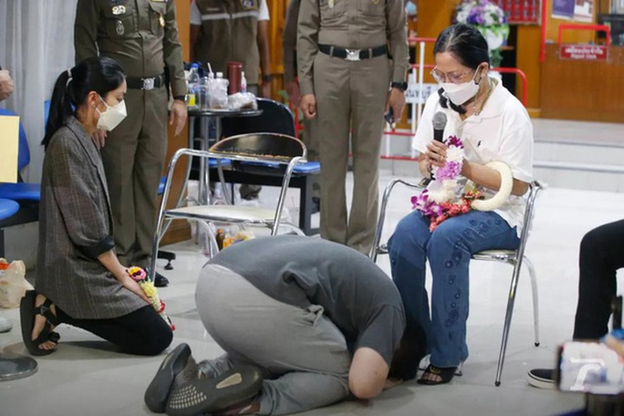 Sáng 3/2, 3 trong số 5 nhân chứng cũng là bạn của nữ diễn viên Tangmo Nida có mặt trên thuyền khi cô gặp nạn đã đến đồn cảnh sát tỉnh Nonthaburi - Thái Lan để gặp mẹ của nạn nhân, dâng hoa và quỳ gối xin lỗi.